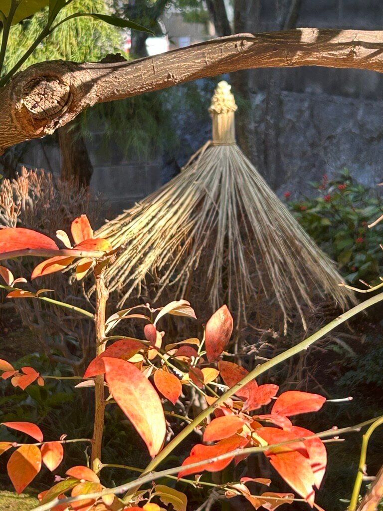 昨年の暮れは、お正月前にと庭中を掃除して最後に、持ってきた藁で何かを編み始めて出来上がったのがこれです。修行に行った岩手の師匠に教わったという「藁ぼっち(わらぼっち)」を、あっという間に作り、庭木に掛けてくれました。